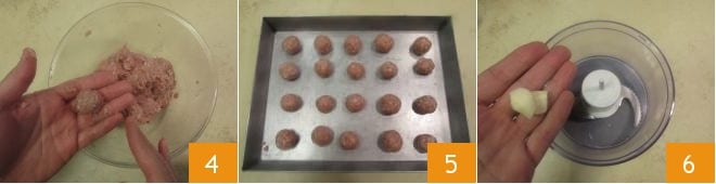 Form meatballs of about 0.5 oz each 4 and place them on a small tray as you go 5. Then put the meatballs to rest in the refrigerator while you can work on the herb mix that will flavor the potatoes. In a mixer, add the peeled garlic 6,