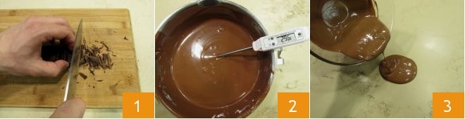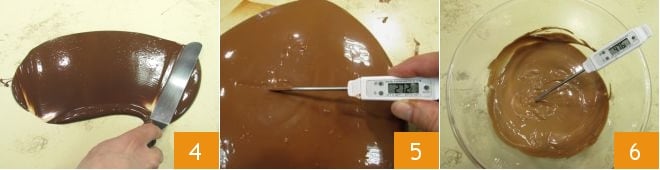 To prepare the milk chocolate and hazelnut Easter egg, start with the tempering: chop the milk chocolate 1, then melt it in a double boiler (the water in the pot should reach just below the bottom of the bowl where you've placed the chocolate); measure the chocolate temperature with a kitchen thermometer 2 and when it reaches 113-122°F, pour 2/3 of it onto the marble slab placed on a work surface (keep the pot with hot water aside) 3; the marble slab serves to bring the chocolate quickly to the desired temperature and is essential for achieving an excellent result.