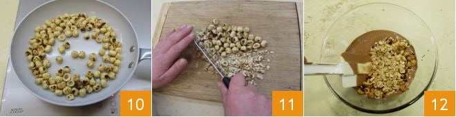 In the meantime, you can toast the hazelnuts in a pan for a few minutes 10, then coarsely chop them 11 and add them to the milk chocolate that you set aside 12.