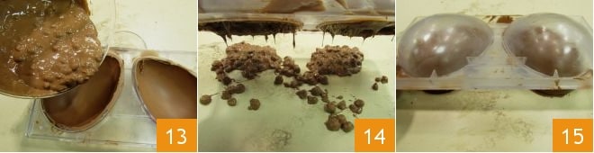 Retrieve the mold and with a scraper, gently scrape off the excess chocolate from the edges of the mold to refine the edges of the egg; then pour the chocolate with hazelnuts 13 into the two halves, rotate to distribute it, and after 1 minute, turn it upside down to let the excess chocolate fall 14. Then let the mold crystallize with the open half facing up for about 2-3 hours. If the temperature exceeds 68°F, it is better to place the mold in the refrigerator to harden. Once solidified, gently unmold the two halves by applying light pressure on the mold 15
