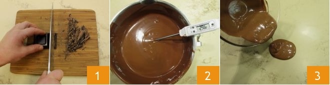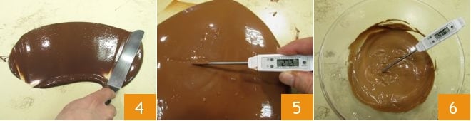 To prepare the milk chocolate Easter egg, chop the chocolate 1 and melt it in a double boiler (it's preferable that the water in the pot does not touch the bottom of the bowl containing the chocolate); measure the temperature with a kitchen thermometer 2 and when the chocolate reaches 113-122°F, pour 2/3 of it onto a marble slab placed on a work surface (the marble serves to cool the chocolate quickly and reach the appropriate temperature) 3
