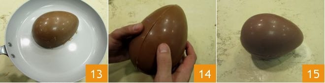 Heat a wide pan of about 9 inches and then place it on the work surface, then place one half of the egg at a time with the edges touching the bottom 13; hold it for just a moment so they warm slightly, then insert the surprise and match the two halves 14. Hold it in place for a few minutes until the two halves are sealed, then your milk chocolate Easter egg is ready to be gifted and enjoyed on Easter day 15!