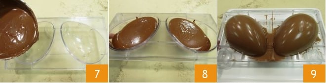 At this point, take the 7-inch mold and pour the melted chocolate into the two halves (7-8); rotate the mold to cover the edges with chocolate, then after 1 minute, turn it over onto a tray to collect the excess chocolate, lightly tapping the edges of the mold to remove air bubbles 9; collect the excess chocolate in a bowl. Let the chocolate solidify for about 10-15 minutes at room temperature.