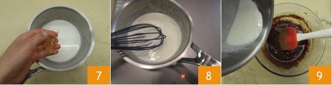 Drain the gelatin and add it to the saucepan 7. Stir with a whisk to dissolve it completely 8 and pour it into the chocolate mixture 9. Stir again with a spatula 9.