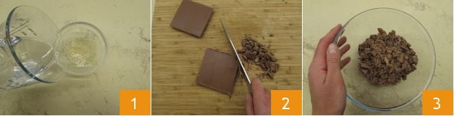 To prepare milk chocolate namelaka, first soak the gelatin in cold water 1. Finely chop the chocolate 2 and transfer it to a bowl 3.