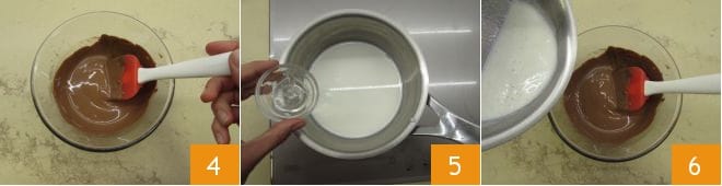 Melt the chocolate in the microwave, activating it for a few seconds at a time and stirring frequently to avoid burning it 4. Pour the milk, cream, and glucose into a saucepan 5 and bring to a simmer. At this point, pour about half of it into the chocolate 6 and mix with a spatula.
