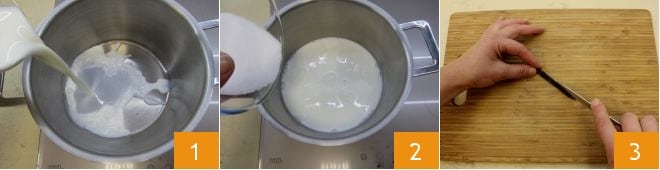 To prepare the milk cream, heat 1 ¼ cups of milk 1 together with the sugar in a saucepan 2. Split the vanilla bean lengthwise and extract the seeds by scraping with a knife 3;