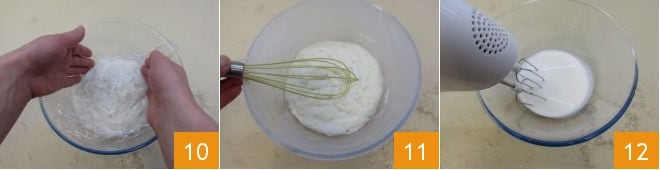 Cover with plastic wrap, making it adhere well to the surface so that the annoying crust does not form 10; let it cool at room temperature and then in the refrigerator. After the necessary time has passed, remove the cream from the refrigerator 11: if you notice any lumps, strain it with a fine sieve to eliminate them. Revive the cream with an electric mixer, then in a separate bowl whip the cold cream from the refrigerator 12.