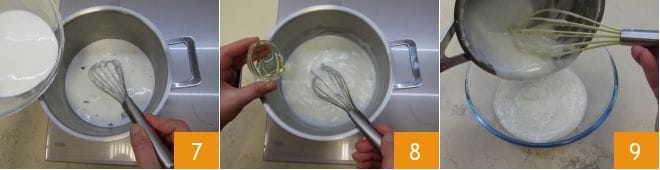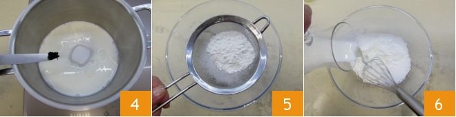 add the vanilla seeds to the milk 4 and heat over very low heat, mixing well with the whisk to dissolve the sugar. In a separate bowl, sift the cornstarch 5, then pour the remaining milk, stirring with a hand whisk 6: this will prevent lumps from forming in the cream.