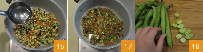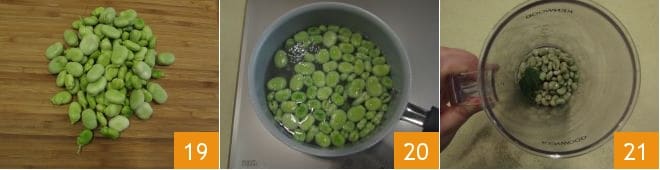 and let it cook for 20 minutes, deglazing with a ladle of hot water or Vegetable broth 16 until they become soft 17. Now start preparing the broad bean cream: shell them one by one 18,
