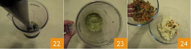 and blend everything with an immersion blender 22 until you get a creamy mixture 23. Add to the cold millet: the vegetables 24,