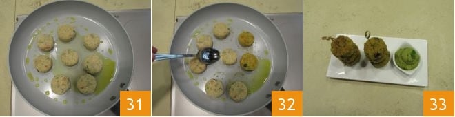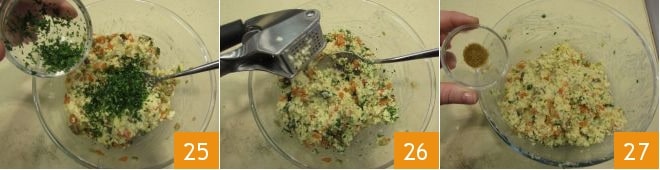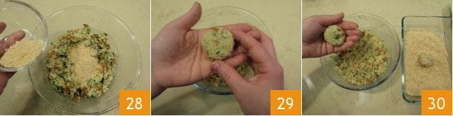 Finally, add 1/2 cup of gluten-free breadcrumbs 28 to achieve a consistency suitable for shaping the balls. Then shape the small balls 29 by taking about 1 oz of mixture at a time and forming a round and slightly flattened shape, then roll each ball in breadcrumbs 30 and continue until the dough is finished.