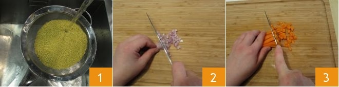 To prepare the millet balls with vegetables and broad bean cream, start by preparing the millet. Rinse the millet well under a stream of cold water and drain it 1, finely chop the shallot 2, and dice the carrot 3.