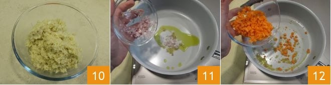 Once cooked, transfer the millet to a bowl 10 and let it cool completely. In another pan, wilt the shallot in a little oil over low heat 11, then add the carrots 12,
