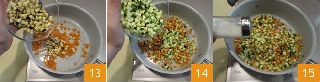 then the eggplants 13 and finally the zucchinis 14. Salt everything 15,