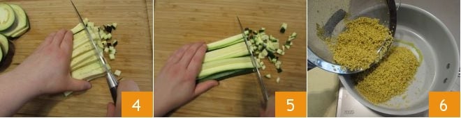 Dice the eggplant 4 and the zucchini 5 as well and set everything aside. Then heat the oil in a pan and add the millet 6,
