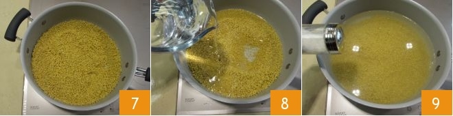 let it toast for a few minutes, stirring occasionally 7, then slowly pour in the hot water 8, add salt 9, and let cook for 25 minutes.