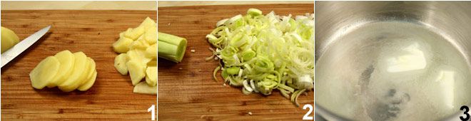 Start preparing the rice soup with leeks and potatoes by washing the potatoes, peeling them, and slicing them 1 first into fairly thin slices then dividing them into four parts. Clean the leeks and cut them 2 finely and melt some butter 3 in a pot.