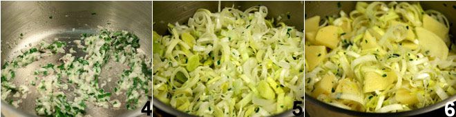 Chop the shallots and parsley, add them to the pot 4 with the butter, and let them fry. Then add the leeks 5 and the potatoes 6, let them season for a few minutes, add salt and pepper.