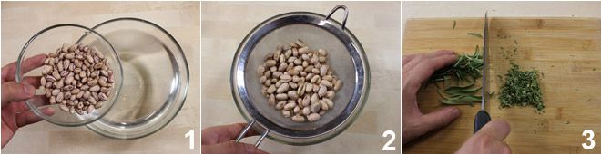 To prepare Milanese Minestrone, soak the beans in water 1 for at least 12 hours, then drain them 2. Finely chop the rosemary and sage together 3 and separately the parsley.
