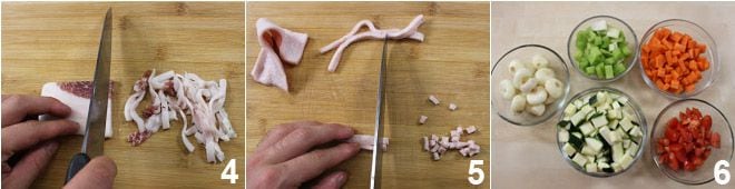 Cut the lard into strips 4 and the rind into very small cubes 5. Wash and, except for the onions which should only be peeled, dice all the vegetables: zucchini, celery, carrots, tomatoes 6, potatoes, and half an onion.