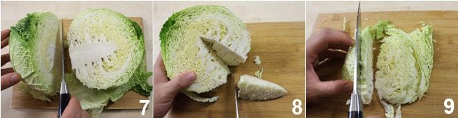 Cut the cabbage in half 7 and remove the white, hard central part by cutting it out with a knife 8. Cut the leafy part into strips 9.