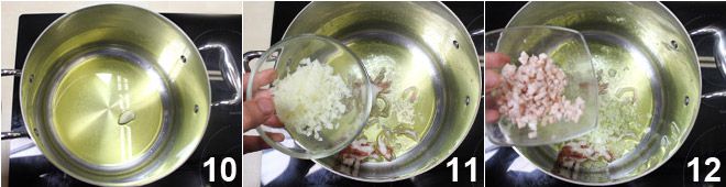Now that all the vegetables are cut, proceed with cooking: in a large pot, pour the olive oil and sauté the garlic clove 10, which you will remove as soon as it is browned. Sauté the lard and chopped onion 11 for a minute, then add the rind cubes, letting them fry for another couple of minutes to flavor the oil well 12.