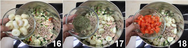 Add the peeled onions 16, season with the chopped sage and rosemary 17, add the chopped tomatoes 18, and