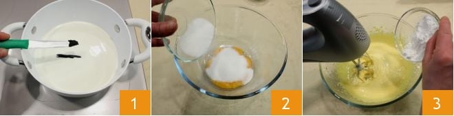 To prepare the mini panettones filled with cream and fruit, start with the Pastry cream, which will be the base of the Diplomat cream (Custard cream and whipped cream): place a large saucepan on the heat with the milk; then slit the vanilla pod with a small knife and extract the seeds to add along with the pod to the milk 1. Turn on the gentle heat and when the mixture has reached a simmer, turn off the heat and let the vanilla infuse for at least 5 minutes. Meanwhile, continue the preparation by separating the egg whites from the yolks; collect the latter in a large bowl and add the sugar 2 (with the leftover egg whites, you can prepare a delicious Angel Cake, some meringues, or Lingue di gatto (flat cookies)). Whisk the egg yolks and granulated sugar with an electric mixer or a hand whisk to obtain a smooth cream. When they are white and frothy, add the sifted cornstarch 3 or rice starch and blend it with the rest of the mixture.