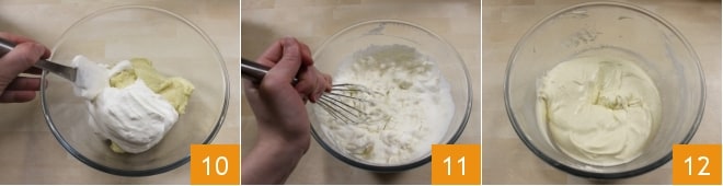 Add the whipped cream to the now cold custard 10 and mix initially with a spatula from top to bottom so as not to deflate it, then with a whisk 11 until you get a frothy and homogeneous mixture 12. Transfer the diplomatic cream into a piping bag with a star tip.