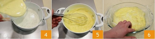 Remove the vanilla pod from the heated milk and add the yolk mixture 4. Turn on the gentle heat again and stir continuously with a whisk to thicken the mixture 5. When the cream is well thickened, turn off the heat and pour it into a low, wide dish; cover it immediately with contact plastic wrap so that an annoying crust does not form 6; then let it cool first at room temperature and then in the refrigerator.