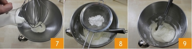 Meanwhile, prepare the whipped cream that you will need to add to the custard to prepare the diplomatic cream: in the bowl of a stand mixer, pour the fresh liquid cream 7 start to whip, then sift in the powdered sugar 8, and blend it with a spatula into the whipped cream 9.