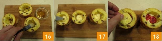 Take the mini panettones and carefully remove the paper wrapping around them 13, being careful not to damage their surface. Cut off the top caps and with a small knife hollow out the inside of the mini panettones (staying about 1/2 inch from the outer edges) 14, then extract the dough 15, which you will cut into discs to form the layers to alternate with the cream.