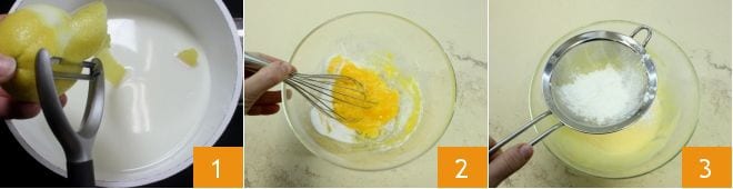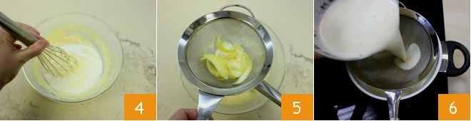 then mix the mixture with a whisk 4. Then pour in the slightly warmed milk, straining the lemon zest with a sieve 5. Mix thoroughly, then put everything back in the saucepan 6.