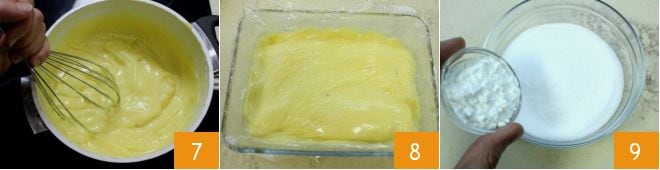 Turn on the low heat and continue mixing until you get a smooth cream 7. Once ready, transfer it to a large bowl and cover with plastic wrap in contact 8. While the cream is cooling, start preparing the meringue: in a small bowl, pour the superfine sugar and then the corn starch 9.