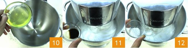 Then in the bowl of a stand mixer, pour the egg whites 10 and start whipping them, adding a pinch of salt. Then add the vanilla extract 11 and continue with the beaters. Also add the cream of tartar 12 (or baking powder),