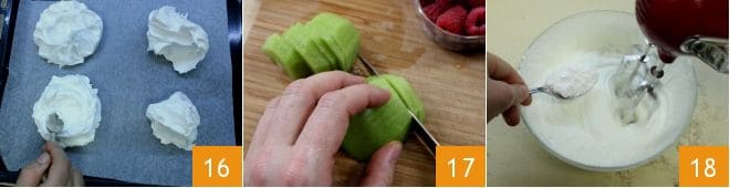 Spread the mixture on a baking sheet lined with parchment paper, forming 4 rather thick discs with slightly raised edges 16. Bake the mini pavlovas in a preheated static oven at 250°F for at least 1 hour. Meanwhile, prepare the fruit for garnishing: peel and slice the kiwi 17 then cut into pieces. Rinse the blueberries, currants, and raspberries under running water. Halve the passion fruit and scoop out the seeds. At this point, whip the cream to add to the lemon custard (for this procedure, you can also consult the cooking school: How to Whip Cream). In a bowl, pour the fresh liquid cream, add powdered sugar if you prefer 18 and run the beaters until you get a fluffy mixture.