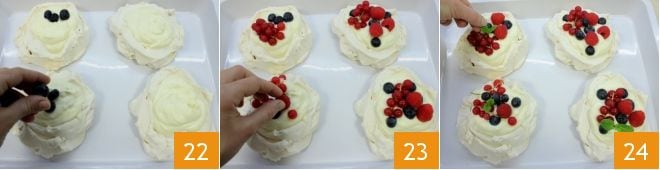 Finally, decorate with the fruit: add the blueberries 22, then the currants, raspberries, kiwi 23, and the passion fruit seeds. Decorate as desired with mint leaves 24. Your mini pavlovas with lemon cream are ready to be enjoyed!