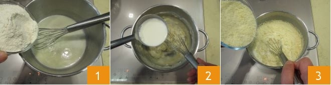 To prepare the mini penne casserole with ham and mozzarella, start by preparing the Parmigiano Cream. Heat a small pot with the milk (it should just come to a simmer), while in another pan melt the butter over low heat and add the flour gradually 1. Stir vigorously with a hand whisk to obtain the roux. When it reaches a golden color, add the milk 2 and mix it with the other ingredients while continuing to cook on low heat. When the béchamel thickens, remove from heat and gradually add the Parmesan 3 to blend well, continuing to stir with the whisk. When the ingredients are fully combined, the Parmesan cream will be ready: set it aside.