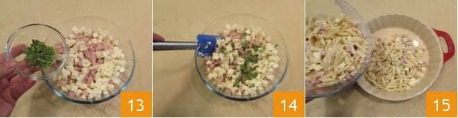 Flavor with finely chopped marjoram 13 and mix the ingredients with a spatula 14. Then transfer the seasoned pasta to an 11-inch diameter baking dish 15, distributing it evenly.
