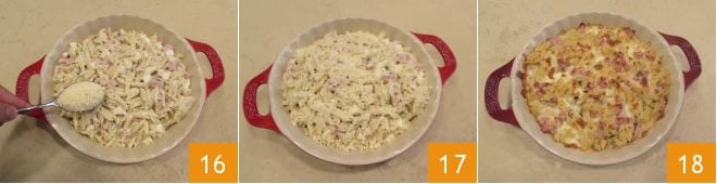 Sprinkle with grated Grana cheese 16 and bake 17 in a static oven preheated to 392°F for 5 minutes, then switch to grill mode for an additional 2 minutes to create a light crust on the surface. Then remove from the oven 18, let it cool slightly to compact the ingredients, and serve your mini penne casserole with ham and mozzarella!