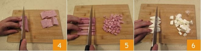 Proceed with the other ingredients for the pasta: cut the cooked ham into slices about 0.4 inches thick 4, then into strips, and finally into cubes 5. Repeat the same with the mozzarella 6.