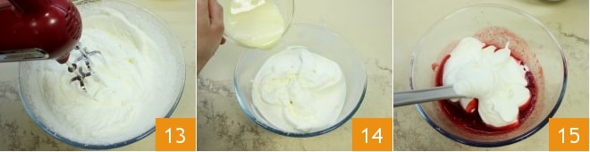 Proceed with the preparation of the cream by whipping with an electric whisk or a mixer, 750 ml of fresh cream 13; for best results, follow our guide on how to whip cream. Pour 180 g of condensed milk into the cream 14 and gently mix with a spatula from bottom to top to not deflate the mixture. Divide the cream and condensed milk mixture into 3 parts and add 1/3 to the raspberry sauce 15,