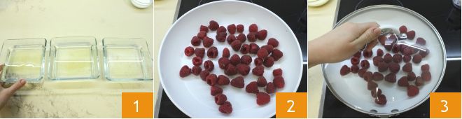 To make the mini millefoglie of chiacchiere, start by soaking the gelatin in cold water for 5 minutes in three separate bowls: 8 g for the raspberry cream, 6 g for the pistachio cream, and 5 g for the white chocolate cream 1 (each cream has a different gelatin dosage based on the ingredient composition; for raspberries, which contain more water and have a high acidity level, the dose will be higher). Focus on the red cream: place the raspberries in a pan 2 and cook over low heat with the lid on 3.