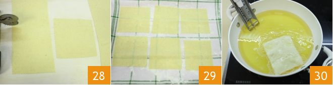 Then with a serrated cutter, cut into square strips 4 inches on each side 28, you will need to obtain 20 chiacchiere. Place the obtained strips on a floured cloth 29. Fry a few chiacchiere at a time in plenty of hot but not boiling seed oil (340°F - 355°F at most), 30 turning them on both sides and being careful not to burn them;
