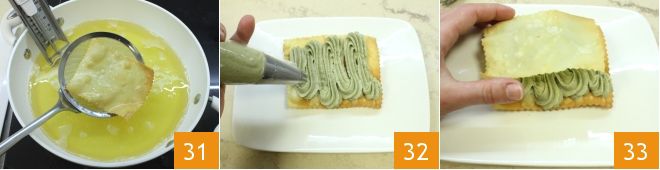as soon as they become golden, drain them with a skimmer 31 and place them to drain on a tray covered with absorbent paper. At this point, you can assemble the dessert: place a chiacchera on a dessert plate, take the 3 creams and transfer them into 3 different pastry bags with a star nozzle, spread a layer of pistachio cream on the dough, then cover with another chiacchiera,