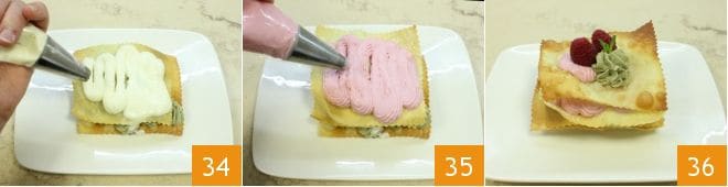 squeeze another layer of white chocolate cream 34 and place another chiacchiera on top; finally, place a layer of raspberry cream 35 and close the millefoglie with the fourth chiacchiera. In total, you will obtain 5 mini millefoglie. Garnish the surface with dollops of creams, fresh raspberries, and some fresh mint leaves. Your mini millefoglie of chiacchiere are ready to brighten up your festive table 36!