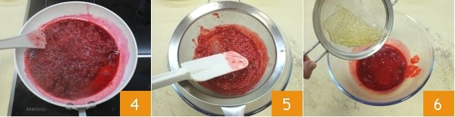 until reduced to a sauce 4, strain the mixture with a sieve to remove the seeds 5 and then incorporate the 8 g of softened and well-drained gelatin into the still warm sauce 6.