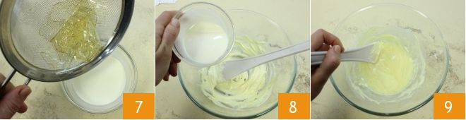 Proceed with the white sauce: squeeze the 5 g of gelatin and dissolve it in 50 ml of hot cream 7, separately melt the white chocolate (in the microwave or bain-marie) and incorporate the cream into the chocolate 8, stir well with a spoon to blend the mixture 9.