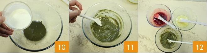 Finally, prepare the green cream: squeeze the 6 g of gelatin and dissolve it in 50 ml of hot cream, incorporate the mixture into the pistachio cream 10 mixing well with a spoon to obtain a homogeneous cream 11. You will have thus obtained the 3 colored sauces that will serve as a base for the creams 12.